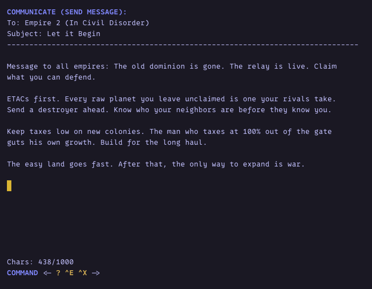 Send empire-to-empire mail without breaking the command-line flow. Coms never leave the game db.