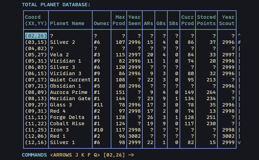 Review your planet database with filters, sorting, and dense tabular output.